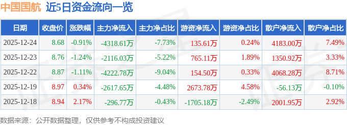 证券之星消息,截至2025年12月24日收盘,中国国航(601111)报收于8.68元,下跌0.91%,换手率0.55%,成交量64.38万手,成交额5.58亿元。