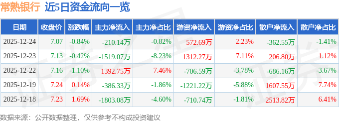 证券之星消息,截至2025年12月24日收盘,常熟银行(601128)报收于7.07元,下跌0.84%,换手率1.1%,成交量36.32万手,成交额2.57亿元。