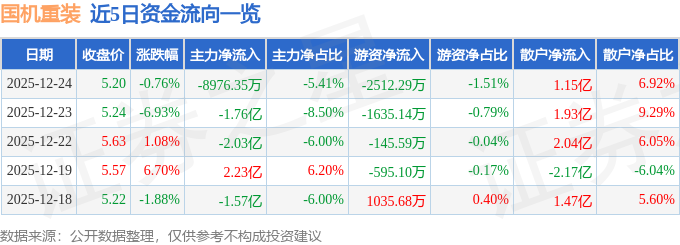 证券之星消息,截至2025年12月24日收盘,国机重装(601399)报收于5.2元,下跌0.76%,换手率4.47%,成交量322.18万手,成交额16.6亿元。