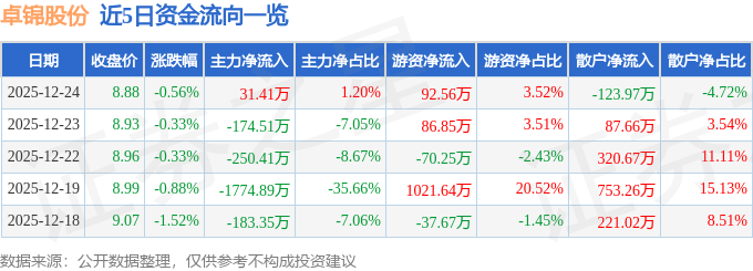 证券之星消息,截至2025年12月24日收盘,卓锦股份(688701)报收于8.88元,下跌0.56%,换手率2.19%,成交量2.94万手,成交额2628.71万元。