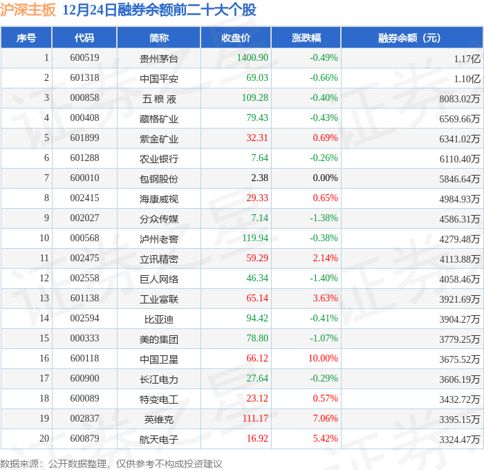 沪深主板融券余额前三分别为:贵州茅台(600519)融券余额1.17亿元、中国平安(601318)融券余额1.1亿元、五 粮 液(000858)融券余额8083.02万元,前20具体见下表: