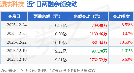 证券之星消息,12月24日,源杰科技(688498)融资买入2.26亿元,融资偿还1.88亿元,融资净买入3720.17万元,融资余额10.81亿元,近3个交易日已连续净买入累计1.65亿元。