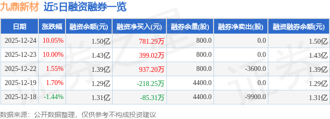 证券之星消息,截至2025年12月24日收盘,九鼎新材(002201)报收于10.29元,上涨10.05%,已连续涨停2天,换手率3.53%,成交量21.23万手,成交额2.16亿元。
