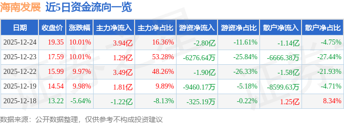 证券之星消息,截至2025年12月24日收盘,海南发展(002163)报收于19.35元,上涨10.01%,已连续涨停4天,换手率15.77%,成交量126.76万手,成交额24.1亿元。