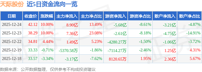 证券之星消息,截至2025年12月24日收盘,天际股份(002759)报收于42.12元,上涨10.0%,已连续涨停2天,换手率31.76%,成交量159.12万手,成交额65.97亿元。