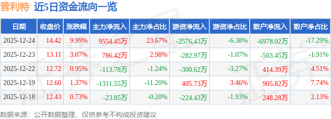 证券之星消息,截至2025年12月24日收盘,普利特(002324)报收于14.42元,上涨9.99%,涨停,换手率3.67%,成交量28.49万手,成交额4.04亿元。
