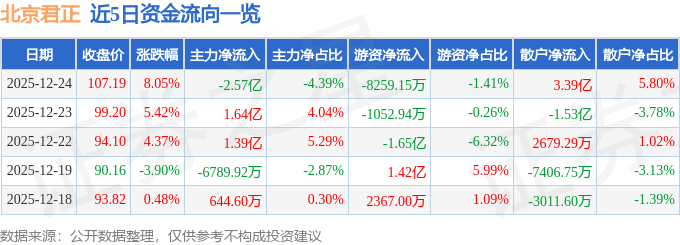 证券之星消息,截至2025年12月24日收盘,北京君正(300223)报收于107.19元,上涨8.05%,换手率13.05%,成交量54.89万手,成交额58.55亿元。