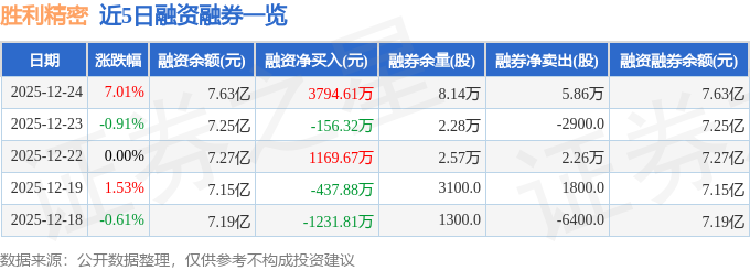 证券之星消息,截至2025年12月24日收盘,胜利精密(002426)报收于3.51元,上涨7.01%,换手率12.46%,成交量424.05万手,成交额15.03亿元。
