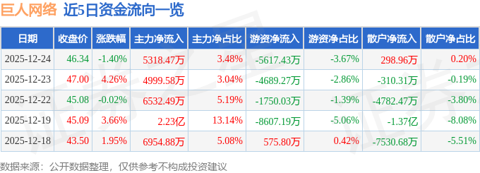 证券之星消息,截至2025年12月24日收盘,巨人网络(002558)报收于46.34元,下跌1.4%,换手率1.73%,成交量33.56万手,成交额15.3亿元。