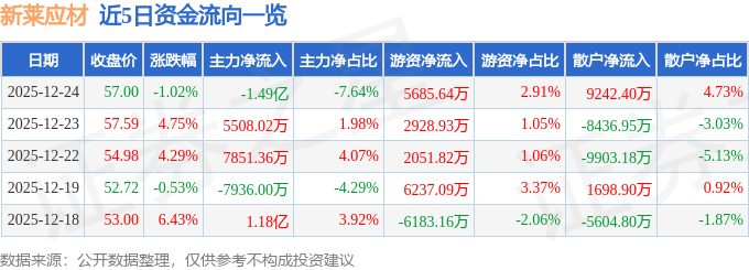 证券之星消息,截至2025年12月24日收盘,新莱应材(300260)报收于57.0元,下跌1.02%,换手率11.99%,成交量34.48万手,成交额19.55亿元。