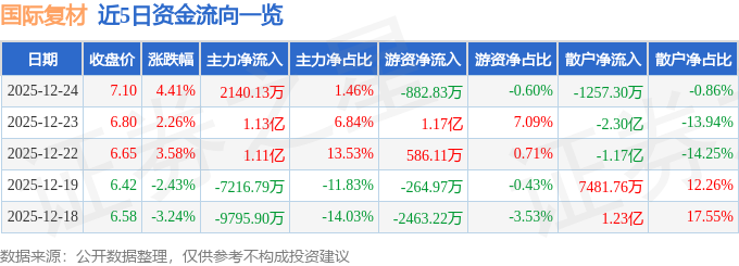 证券之星消息,截至2025年12月24日收盘,国际复材(301526)报收于7.1元,上涨4.41%,换手率14.94%,成交量209.81万手,成交额14.64亿元。