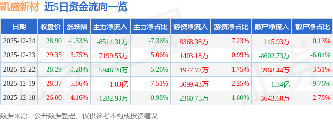 证券之星消息,截至2025年12月24日收盘,凯盛新材(301069)报收于28.9元,下跌1.53%,换手率10.2%,成交量39.91万手,成交额11.57亿元。