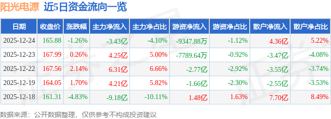 证券之星消息,截至2025年12月24日收盘,阳光电源(300274)报收于165.88元,下跌1.26%,换手率3.18%,成交量50.56万手,成交额83.5亿元。