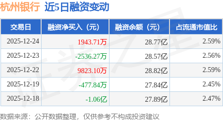 证券之星消息,12月24日,杭州银行(600926)融资买入7825.46万元,融资偿还5881.75万元,融资净买入1943.71万元,融资余额28.77亿元。