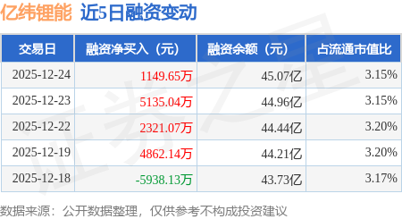 证券之星消息,12月24日,亿纬锂能(300014)融资买入3.63亿元,融资偿还3.52亿元,融资净买入1149.65万元,融资余额45.07亿元,近3个交易日已连续净买入累计8605.77万元,近20个交易日中有13个交易日出现融资净买入。