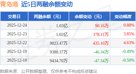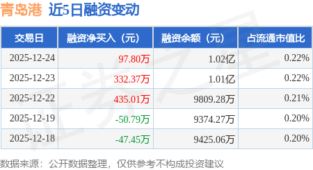证券之星消息,12月24日,青岛港(601298)融资买入823.18万元,融资偿还725.38万元,融资净买入97.8万元,融资余额1.02亿元,近3个交易日已连续净买入累计865.18万元。