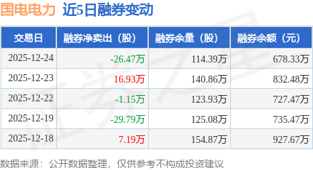证券之星消息,12月24日,国电电力(600795)融资买入3730.49万元,融资偿还3637.1万元,融资净买入93.39万元,融资余额8.38亿元。