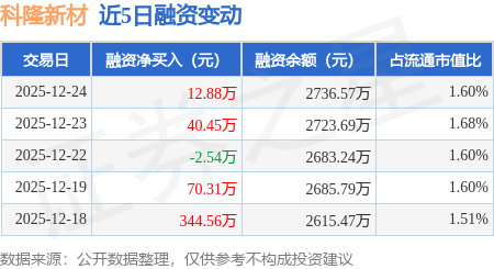 证券之星消息,12月24日,科隆新材(920098)融资买入393.46万元,融资偿还380.58万元,融资净买入12.88万元,融资余额2736.57万元,近20个交易日中有11个交易日出现融资净买入。