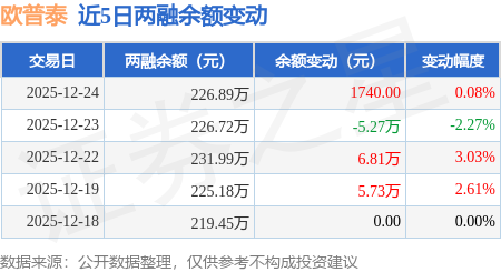 证券之星消息,12月24日,欧普泰(920414)融资买入5.29万元,融资偿还5.12万元,融资净买入0.17万元,融资余额226.89万元。