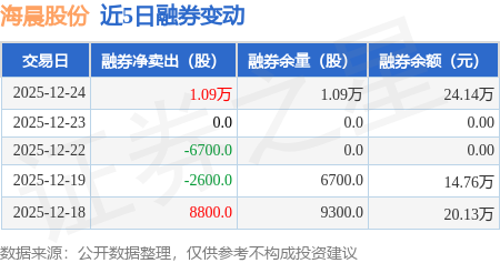 证券之星消息,12月24日,海晨股份(300873)融资买入929.79万元,融资偿还930.24万元,融资净卖出0.45万元,融资余额2.13亿元。