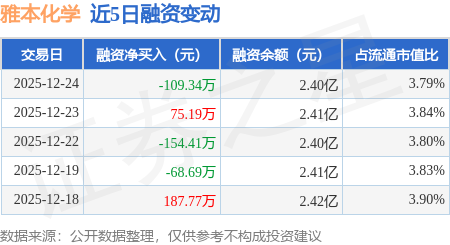 证券之星消息,12月24日,雅本化学(300261)融资买入519.27万元,融资偿还628.62万元,融资净卖出109.34万元,融资余额2.4亿元。