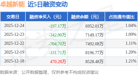 证券之星消息,12月24日,卓越新能(688196)融资买入326.06万元,融资偿还523.23万元,融资净卖出197.17万元,融资余额6952.01万元。