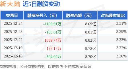 证券之星消息,12月24日,新 大 陆(000997)融资买入1521.3万元,融资偿还2711.22万元,融资净卖出1189.91万元,融资余额8.69亿元。