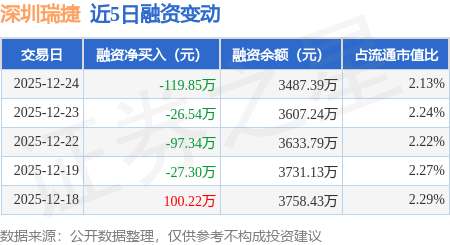 证券之星消息,12月24日,深圳瑞捷(300977)融资买入343.18万元,融资偿还463.03万元,融资净卖出119.85万元,融资余额3487.39万元。