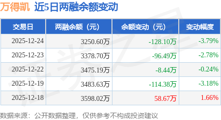 证券之星消息,12月24日,万得凯(301309)融资买入213.04万元,融资偿还341.14万元,融资净卖出128.1万元,融资余额3250.6万元。