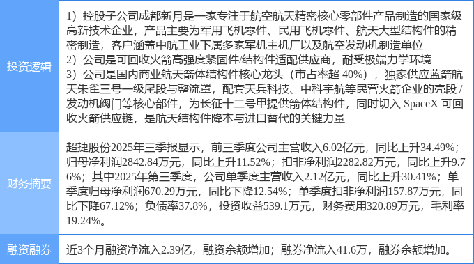 该股为SpaceX概念股,航天,通用航空概念热股,当日SpaceX概念股概念上涨10.79%,航天概念上涨4.2%,通用航空概念上涨3.77%。