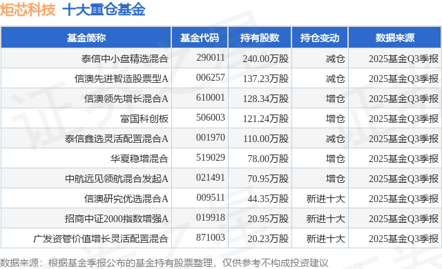 根据2025基金Q3季报公募基金重仓股数据,重仓该股的公募基金共22家,其中持有数量最多的公募基金为泰信基金的泰信中小盘精选混合。泰信中小盘精选混合目前规模为17.22亿元,最新净值4.552(12月24日),较上一交易日上涨1.88%,近一年上涨34.12%。该公募基金现任基金经理为董季周。董季周在任的基金产品包括:泰信鑫选灵活配置混合A,管理时间为2020年11月24日至今,期间收益率为14.69%。
