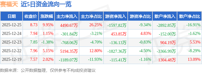 证券之星消息,截至2025年12月25日收盘,赛福天(603028)报收于8.73元,上涨9.95%,涨停,换手率7.16%,成交量20.34万手,成交额1.71亿元。