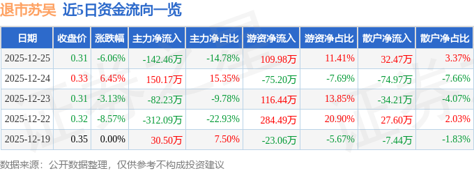 证券之星消息,截至2025年12月25日收盘,退市苏吴(600200)报收于0.31元,下跌6.06%,换手率4.24%,成交量30.13万手,成交额963.73万元。