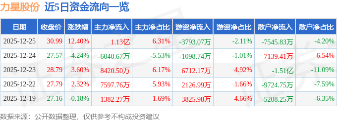 证券之星消息,截至2025年12月25日收盘,力星股份(300421)报收于30.99元,上涨12.4%,换手率26.39%,成交量60.79万手,成交额17.98亿元。