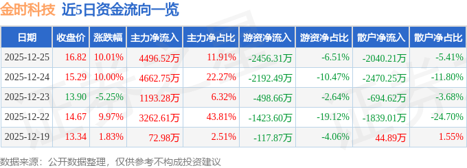证券之星消息,截至2025年12月25日收盘,金时科技(002951)报收于16.82元,上涨10.01%,已连续涨停2天,换手率5.93%,成交量23.77万手,成交额3.77亿元。