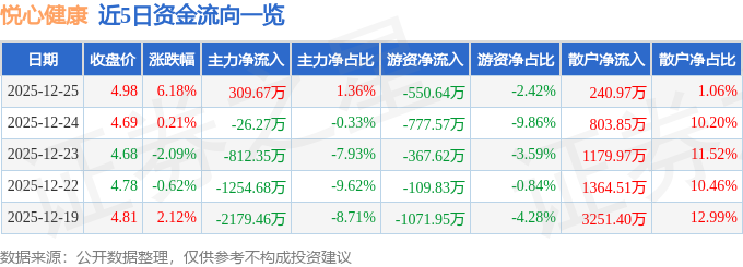 证券之星消息,截至2025年12月25日收盘,悦心健康(002162)报收于4.98元,上涨6.18%,换手率5.06%,成交量46.51万手,成交额2.27亿元。