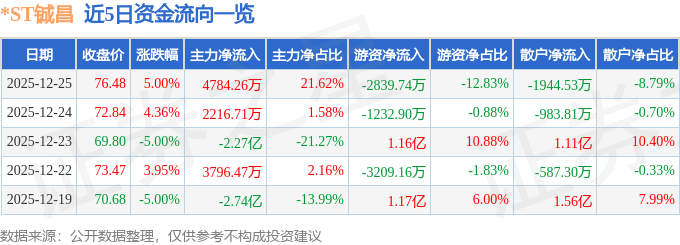 证券之星消息,截至2025年12月25日收盘,*ST铖昌(001270)报收于76.48元,上涨5.0%,换手率1.44%,成交量2.94万手,成交额2.21亿元。