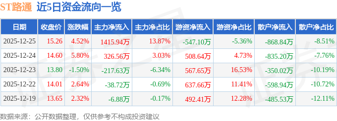证券之星消息,截至2025年12月25日收盘,ST路通(300555)报收于15.26元,上涨4.52%,换手率3.45%,成交量6.83万手,成交额1.02亿元。