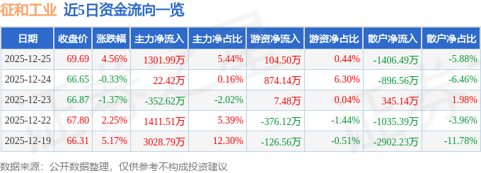 证券之星消息,截至2025年12月25日收盘,征和工业(003033)报收于69.69元,上涨4.56%,换手率4.29%,成交量3.46万手,成交额2.39亿元。