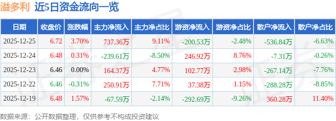 证券之星消息,截至2025年12月25日收盘,溢多利(300381)报收于6.72元,上涨3.7%,换手率2.48%,成交量12.15万手,成交额8094.05万元。