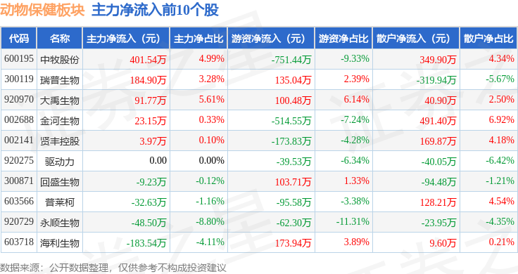 从资金流向上来看,当日动物保健板块主力资金净流出7841.72万元,游资资金净流入284.59万元,散户资金净流入7557.14万元。动物保健板块个股资金流向见下表: