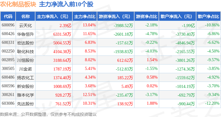 从资金流向上来看,当日农化制品板块主力资金净流出3934.12万元,游资资金净流出3928.58万元,散户资金净流入7862.7万元。农化制品板块个股资金流向见下表:
