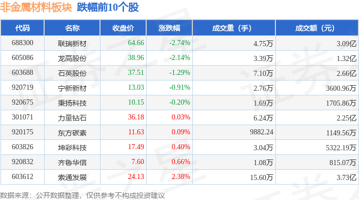 证券之星消息,12月25日非金属材料板块较上一交易日下跌0.61%,联瑞新材领跌。当日上证指数报收于3959.62,上涨0.47%。深证成指报收于13531.41,上涨0.33%。非金属材料板块个股涨跌见下表: