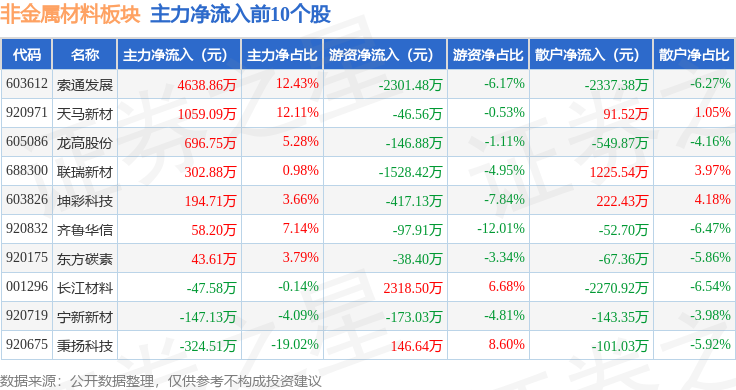 从资金流向上来看,当日非金属材料板块主力资金净流入915.74万元,游资资金净流出3862.59万元,散户资金净流入2946.85万元。非金属材料板块个股资金流向见下表: