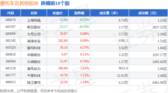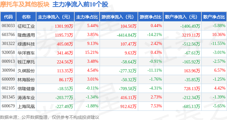 从资金流向上来看,当日摩托车及其他板块主力资金净流出5578.05万元,游资资金净流出2469.76万元,散户资金净流入8047.82万元。摩托车及其他板块个股资金流向见下表: