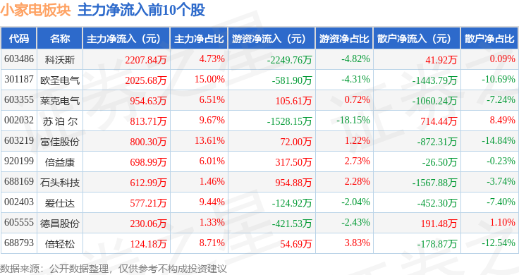 从资金流向上来看,当日小家电板块主力资金净流入2700.55万元,游资资金净流出3888.7万元,散户资金净流入1188.15万元。小家电板块个股资金流向见下表: