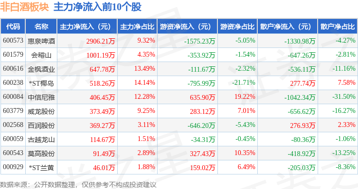从资金流向上来看,当日非白酒板块主力资金净流入3861.1万元,游资资金净流出2127.31万元,散户资金净流出1733.79万元。非白酒板块个股资金流向见下表: