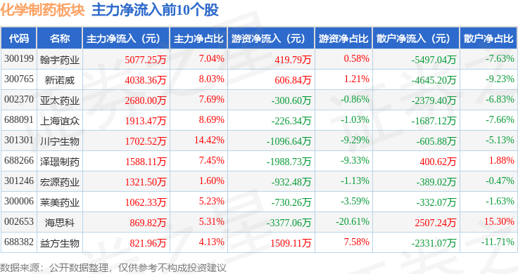 从资金流向上来看,当日化学制药板块主力资金净流出10.89亿元,游资资金净流入453.95万元,散户资金净流入10.84亿元。化学制药板块个股资金流向见下表:
