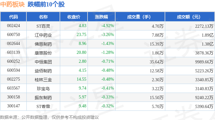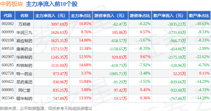 从资金流向上来看,当日中药板块主力资金净流出1.3亿元,游资资金净流出3269.99万元,散户资金净流入1.63亿元。中药板块个股资金流向见下表:
