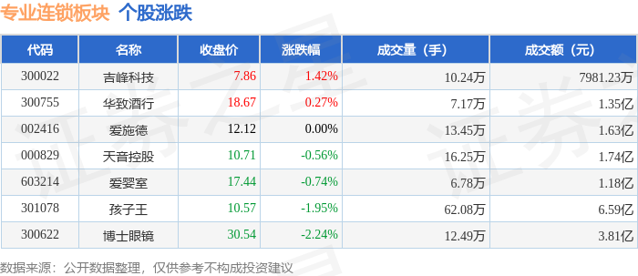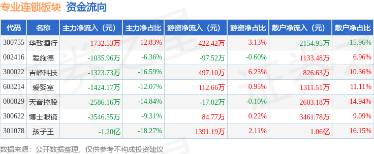 从资金流向上来看,当日专业连锁板块主力资金净流出2.02亿元,游资资金净流入2393.6万元,散户资金净流入1.78亿元。专业连锁板块个股资金流向见下表: